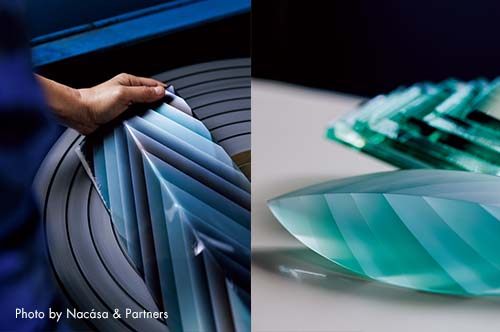 硬質なガラスに、色彩のグラデーションが柔らかさを宿す。建材である板ガラスを素材に、高度な研磨技術を幾重にも加えることでグラフィカルなイメージを立体のオブジェに落とし込むガラス造形作家、小島有香子さん。ミリ単位で緻密に研ぎ澄まされた作品は光を受けたとき、計算を超えた表情を見せました。