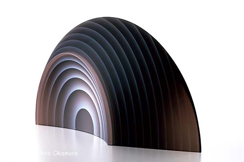 富山の大地に沈む太陽をモチーフにしたオブジェ「Layers of Light -Sun-」(W700㎜×D135㎜×H370㎜)。ブラウンの板ガラスを13枚重ね、曲面に研磨して厚みを変えることでグラデーションを描いた。Photo by Kichiro Okamura