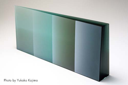 6枚のガラスを大きくずらしながら斜めに重ね、シンプルな形に仕上げたオブジェ「Layers of Light #12-3」(W400㎜×D60㎜×H180㎜)。色が重なった小口も美しい。場所に合わせて立てて飾ることも想定している。Photo by Yukako Kojima