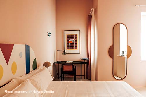 感情に触れる空間を追求するJaimeにとって、プライベートスペースは心を解きほぐす場であることが重要だ。淡いピンクのベールを纏ったような室内は、壁、ファブリックやミラーに至るまで柔らかな暖色で統一され、包み込まれるような安心感を生む。