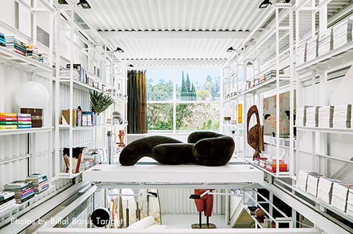 三層構造の中央が吹き抜けになったGiampiero Tagliaferriの自宅兼アトリエは、壁面から天井まで白いスチールで覆われている。可動式のスチール製書架が壁一面を占め、機能性と構造美が一体化。空間を照らすのは、大きく開いた窓から差し込む自然光だ。そこに、イタリアの洗練された雰囲気とカリフォルニアの自由な感性をつなぐヴィンテージ家具やアートを配し、無骨な空間がクリエイティブで明るいエネルギーに満ちている。