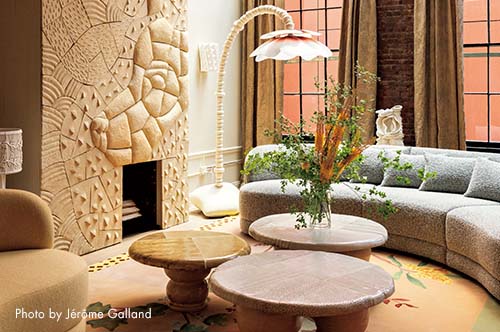 伝統的なクラフツマンシップを重んじるLauraの手掛けるインテリアには、彫刻的なセラミックが随所に取り入れられている。たとえば、暖炉を包むダイナミックなセラミックウォールや、壁面を優しく照らすフロアランプなどの陶芸作品は、有機的でありながら洗練された佇まい。手仕事でつくられたインテリアが、モダンな空間に温かな人間性を添えている。