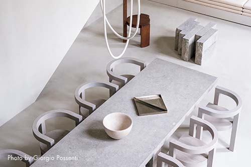 イタリアのデザイナー、Elisa Ossinoが手掛ける、キッチン家電ブランド、V-ZUGのミラノスタジオ。現代的なテクノロジーと職人の手仕事、天然素材による温もりあるミニマリズムが核となる。グレーの濃淡を繊細に重ねながら、石やタイル、漆喰といった異なる素材の質感を引き立て、豊かな表情を生み出した。空間に静かに呼応するような、素材感をそろえた家具により、視覚的な調和を演出している。