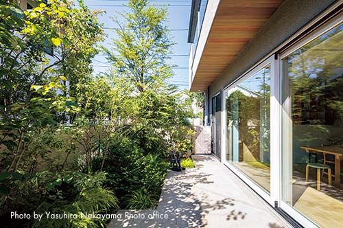 アプローチと中庭を共有する長屋の賃貸併用住宅