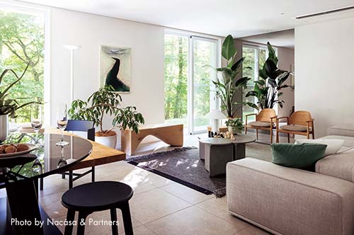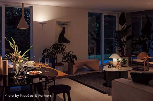 1969年に誕生し、イタリアモダン家具、そしてかの地の暮らしの価値観を取り入れながら、日本のライフスタイルに調和する家具を生み出してきたアルフレックスジャパン。「明かりも家具同様に暮らしの道具」との信念のもと、2016年からオリジナル照明の開発を手掛けてきました。ブランドの思想を体現した空間、カーサミア河口湖で、建築と家具、照明が織り成す関係を探ります。