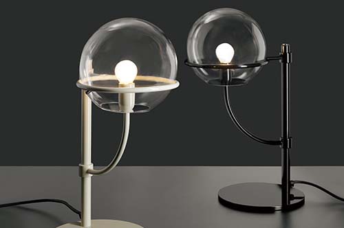 写真上/リビングのメーン照明は、フロアランプ「BOUNCE」の半球型シェードから上向きに放つ光が天井と壁にバウンドした間接光。テーブルランプ「GEO 40」とペンダントライトを加えて空間の手前と奥、高い所と手元と、光を点在させて強弱のバランスをとった。特に、ソファに座った際の目線の高さに置いたテーブルランプの明かりが落ち着きをもたらす。日中は白くシンプルな造形がインテリアに溶け込み、家具やアートを引き立てる。
