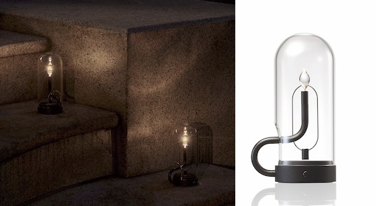 持ち手から伸びた軸の先端から光が投射され、特殊な形状のレンズによって屈折し、ろうそくのような明かりが浮かび上がる。最大連続点灯時間約24時間。本体はアルミニウム製、シェードはガラス製。サイズ:W96×D69×H177※充電台含む 価格:29,700円 提供/アンビエンテック TEL.045-441-0082 URL:https://ambientec.co.jp