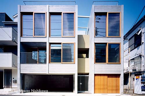姉妹で相続した土地を半分売却し、その収益を建築費に充当することで残り半分の土地に賃貸併用住宅を建てた。細長い台形の住戸を三戸並べ、かつ三層に重ねて九戸の住戸を計画した。メゾネットにした最上層の三戸のうち二戸をオーナー姉妹それぞれの住まいに。将来的に姉妹が建物内の別の住戸へ移り、貸し出す可能性も考え、プランやインテリア、設備は全戸を同グレードにそろえた。賃貸住戸にも広いキッチンや無垢材貼りの床といった姉妹のこだわりを反映。似た価値観の借り手が集まり、良好なコミュニティーを築いている。