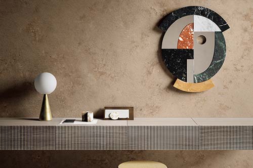 アメリカのデザイナー、Stephen Burksによるイタリア・SALVATORIのミラー。色とりどりの大理石をカットして、生き生きとした表情を描いたデザインが魅力だ。全2色(φ760×D36)1,241,900円 納期:6カ月/エ インテリアズ|ボッフィデパドヴァ東京
