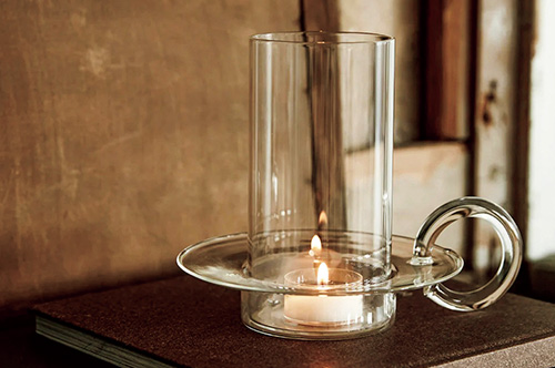 デンマーク・Ferm Livingのガラス製キャンドルホルダーは、シンプルな円筒形の本体に付いた丸い取っ手が燭台を思わせる。上下でパーツが分かれており、火をともしやすい。全2色(W170×D145×H140)7,810円 納期:約2〜5日(在庫状況による)/KOZLIFE
