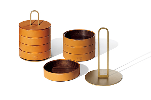 上海とロンドンに拠点を置くデザインユニット、Neri&Huによるイタリア・Poltrona Frauのコンテナ。四つの蓋付きのトレーを中央の支柱に沿ってスタッキングできる。レザー製。全2サイズ、全2色(φ144×H210)264,000円 納期:即日(在庫状況による)/ポルトローナ・フラウ東京青山