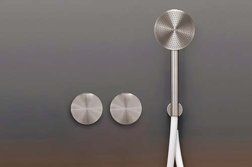 イタリア・CEAのシャワー水栓は、正円のデザインで統一したシャワーヘッドと操作ハンドルの形状が美しく洗練された印象を与える。ステンレススチール製で、ホースはシリコン製。全10色(W230×L235・ホースL1500)822,800円 納期:約3カ月/カネジン