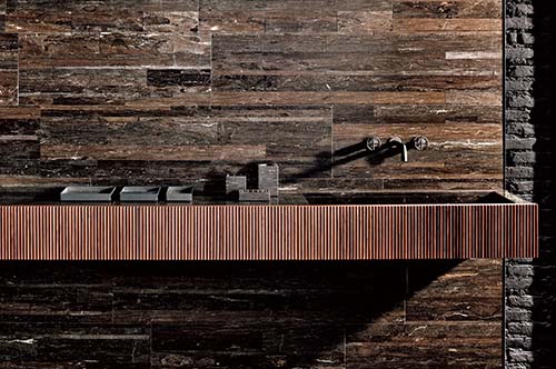 引き出しと一体にデザインされた、イタリア・Salvatoriの壁付け型洗面器。リブ仕上げのウォールナット材製の面材が空間のアクセントとして映える。シンクは大理石製、全6色(W894×D460×H400)価格と納期は要問い合わせ/エ インテリアズ|ボッフィデパドヴァ東京