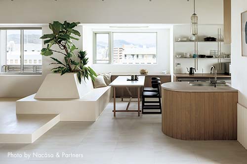 均質な空間に個性を与える、緑と一体の造作ベンチ